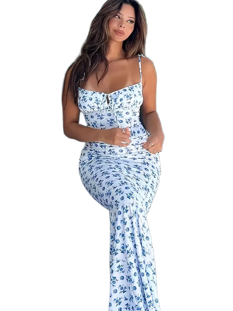Kvinnors Sjöjungfruklänning med Blommönster och Spaghettiband - Sexig Elegant Blått Blommigt Mönster, Mellanstretch Tyg som Kan Tvättas i Maskin, Året Runt Anpassningsbar för Vardagliga & Formella Tillfällen, Axelbandsdesign, Medium Stretch Material