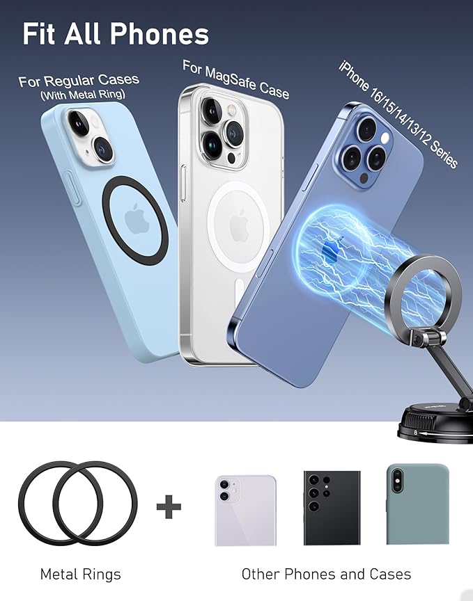 Universell kompatibilitet: Denna universella Blukar bilhållare är lämplig för alla smartphones med Magsafe-funktioner, kompatibel med iPhone 16/16 Pro/16 Plus/16 Pro Max/15 Pro/15 Pro Max/14 Plus/14/13/12 Pro Max/Pro, etc. Om din smartphone inte har MagSafe-funktionalitet kan du fästa en metallring på fodralet (ingår). Med metallringen kan hållaren vanligtvis användas. Därför är detta stativ lämpligt för alla smartphones.