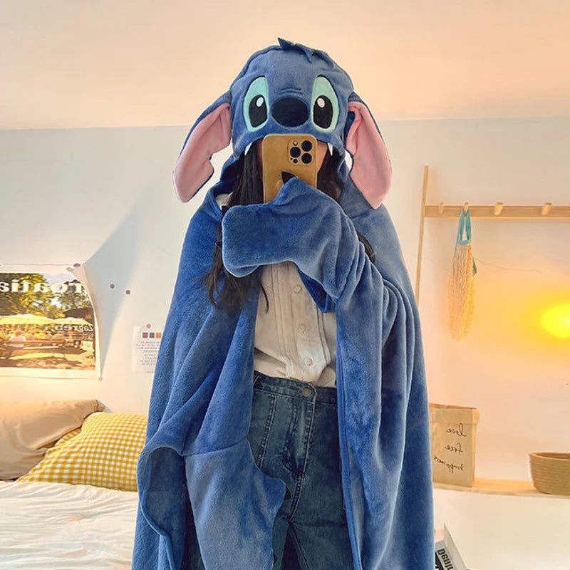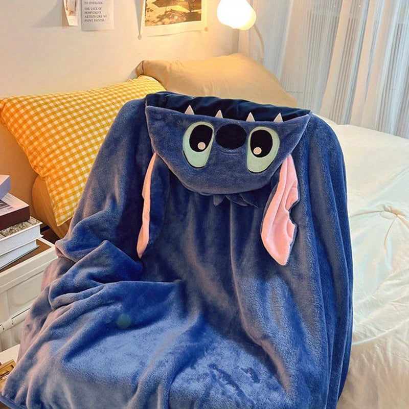 Godkänd Disney Stitch plysch huva-sjal - mjuk dubbelsidig blå kappa med öron och ögon, bekväm resefilt, lämplig för tupplur på kontoret, solstol och utomhusäventyr