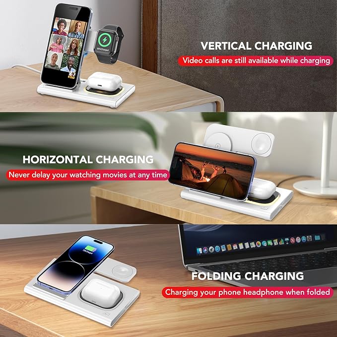 [Vikbar bärbar laddningsstation för Apple] Denna reseladdare för iPhone och Apple Watch är lätt och vikbar, den ger en stabil laddningsupplevelse när du reser eller är på affärsresor. 4-stegs lutningsjustering, stöder vertikal och horisontell trådlös laddning, bekvämare videosamtal.